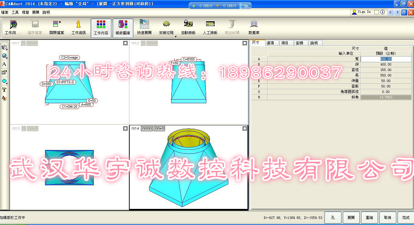 9、隨機配套提供風管展開切割專用軟件,無需掌握復雜的繪制及計算。只需選擇相應的風管類型,輸入簡單參數即可自動生成加工程序進行切割加工。